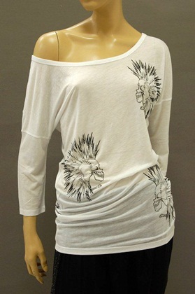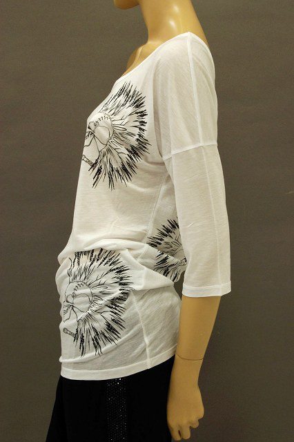 薄手のカットソー素材に印象的なスカルプリントにブラックスパンコールをつけた変形カットソー。