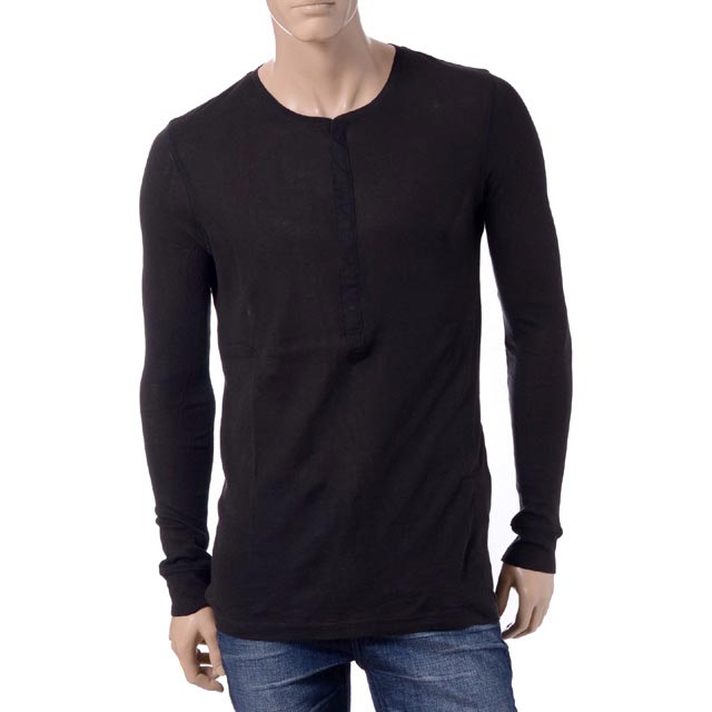 ブラックデニムのシンプルかつベーシックなヘンリーネックTシャツ。スタイリッシュに着こなすのもおすすめ。シックなブラックカラー。スタイリッシュに着こなすのもおすすめ。