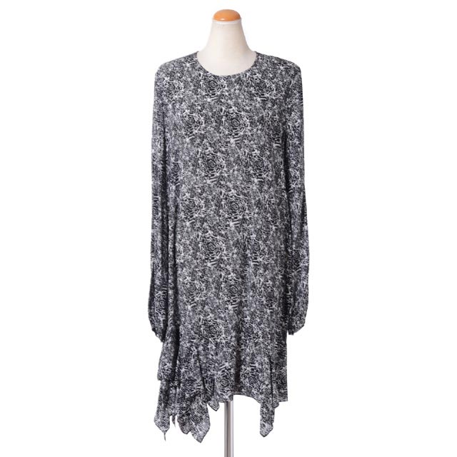 裾のカッティングが可愛い長袖ワンピース。クルーネック。後ろファスナーで開閉。袖口はスナップボタンで開閉。すとんと落ち感のあるレーヨン素材は美しいシルエットを演出。裾は2段になっており、歩くたび違う表情が楽しめるレイヤードディテール。チュニックとしてもお召し頂けます。トーマスならではの洗練された繊細な柄はまさに逸品。ジャケットやカーディガンにも映える一枚です。