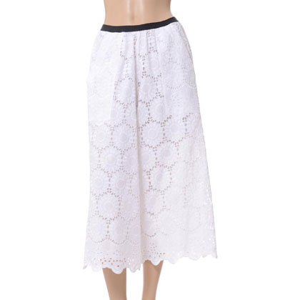 プレコレクション。美しいヒマワリの真っ白なレース使いクロップドワイドパンツ。ウエストゴムでまるで履いていないような生地感。美しいヒマワリモチーフのレース使い。両サイドにポケット付き。広がった裾がなんともエレガントでおしゃれなアイテムです。透け感がありますので、下着を白か肌に近い色を選んでください。