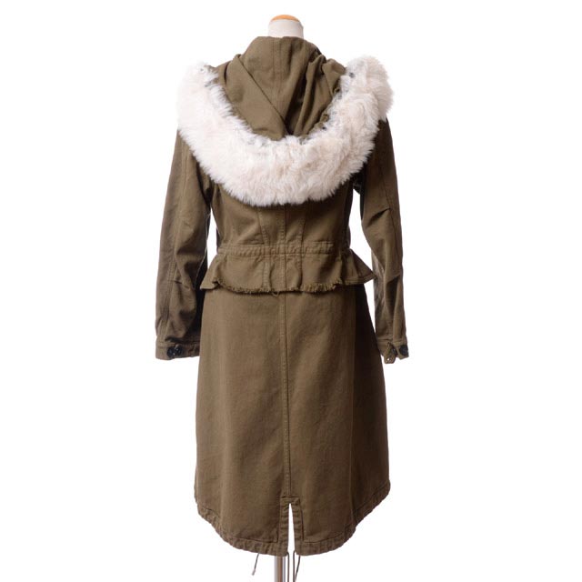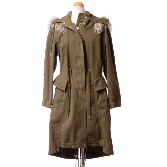 Emb Shearl Parka。背中に豪華なスパンコールで翼を広げた梟をあしらったファー付きモッズコート。ヴィンテージ風なコットン生地に取外し可能な羊毛皮ファー付き。カーキにホワイトのファーはキュート。