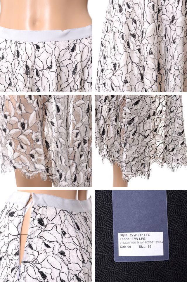 総レースのホワイト・ブラックレースカラーロング丈スカート。美しいホワイトに黒のレースをあしらったエレガントなスカートです。アシンメトリーなシルエットでボリューム感のある軽いレーススカートです。