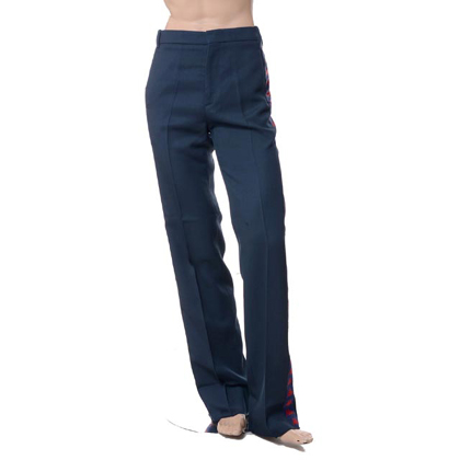ショールック18。POP RUFF。濃いネイビーにカッパ入りのクールなボトムス。ワイドフォルムシルエット、着心地のよいさらりとしたウール。きれいめにお召いただけるユニセックスなボトムスです。