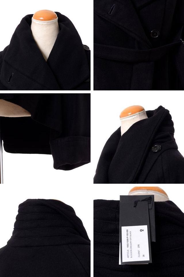 変形立ち襟の厚手のウールコート。フォルムはマントのようなシルエット、さらりと羽織ることのできる凝ったデティールのジャケットです。胸元にベルト付き。