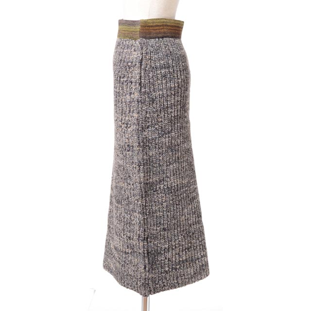 MULTI COLOR KNIT SKIRT 着痩せして見えるミックスロービンヤーンのニットロングスカート。縦長のIラインシルエットは美しいヒップラインシルエットを見せてくれるアイテムです。やや厚手でしっかりとしたニットスカートです。シフォンのブラウスやデニムジャケットと合わせて着こなしたいスカートです。カラー展開、ブラウン、グレー。