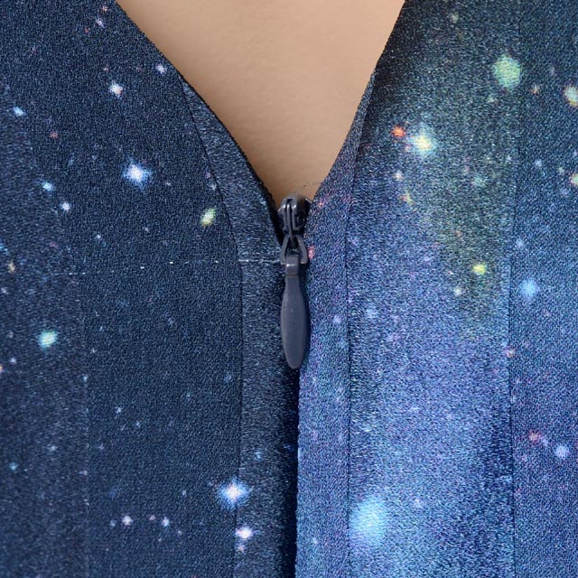 JUMPSUIT NORMA GALAXY 。定番になりつつあるオールインワン。プリントは宇宙プリント。ウエストは切り替えがあり両サイドにポケット付き。光沢のあるサテン生地。ニットと合わせて着こなしたいアイテムです。
