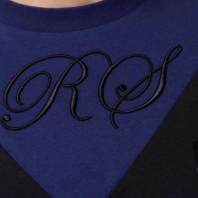 ラフシモンズ フレッドペリーからVインサートTシャツ。ブラックカラー。リラックスロングフィットで作ったコットンジャージーTシャツです。V型トーンパネルとコレクションのイニシャル刺繍がデザインされています。胸のブランドラバーバッジで仕上げられています。
