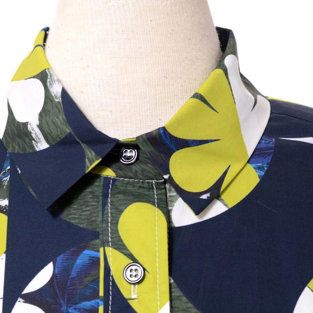ビックシルエットのシャツ襟ワンピース。前開きのリラックスフォルム、羽織ものとしてもおつかいただけるエレガントなアイテムです。幾何学模様にハワイアンプリントを重ねた落ち着いたトーンのアイテムです。ご自宅でもお洗濯が可能なこれからのシーズンにぴったりなシャツ襟ワンピースです。カラー展開、ホワイト・ネイビー。