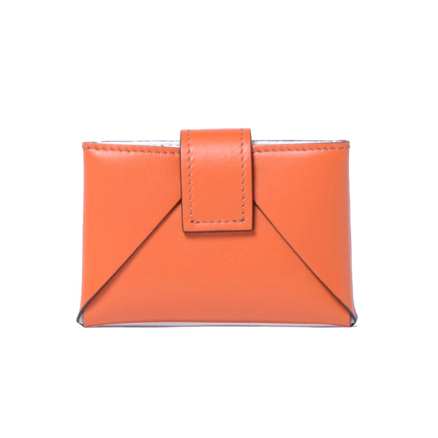バイカラーのキュートな名刺入れ。ゴールドのMARNIロゴ入り。スナップボタン付きのストラップで開閉。綺麗なレッドブラウンオレンジブラウンカラー。内側はホワイト。手に馴染む柔らかで上質な牛革を使用。プレゼントにも喜ばれるカードケースです。
