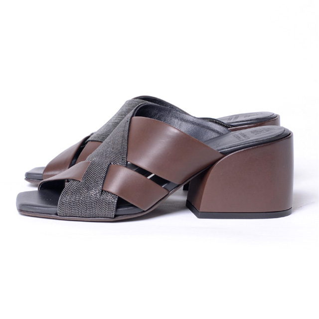 ブルネロクチネリ (Brunello Cucinelli) スクエアサンダル 牛革 ブラウンミックス