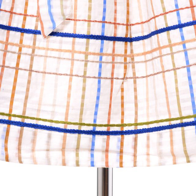 半袖のリラックスシャーリングワンピース。マドラスチェック柄に暖かみのある刺繍でラインをあしらったとても凝ったファブリック。さらりとした薄手のガーゼコットン、裏地付きで、両サイドにポケット、紐付き。裾に向かって、フレアーライン。優しい雰囲気のリラックスワンピースです。カラー展開、ベージュチェック・パステル・ブルー。すべて、手作業による素材を手紬でつくり、染色・プリントもインドで生産されており、手作業による暖かみを感じるデザインです。刺繍のロゴ入り収納袋付き。