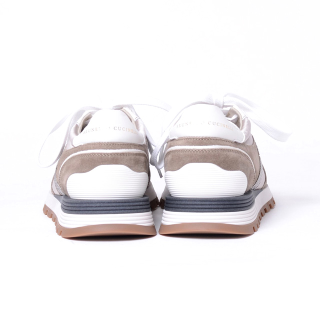 優しいトープカラー、サイドにビジュー使いのブルネロクチネリのスニーカー。機能性抜群で、ソールにクッション入りの履きやすいアイテムです。アッパー部分はナイロンとバックスキン、かかと部分はゴールドでロゴ入り。3色のラバーソールです。箱、ロゴ入り収納袋、替え紐付き。