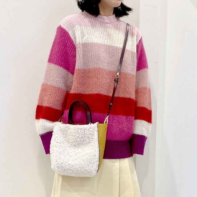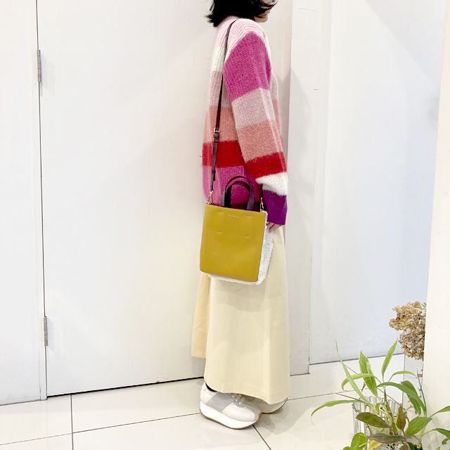 MUSEOバッグ。ふわふわのホワイトムートンを使用した2ハンドル、肩掛けできるバッグ。表はすべらかなカーキ色のレザーと持ち手部分がエンジで色の対比がおしゃれなバッグです。そして、とても軽いのが特徴です。マルニらしい3トーンカラーバッグの冬用の可愛いバッグです。