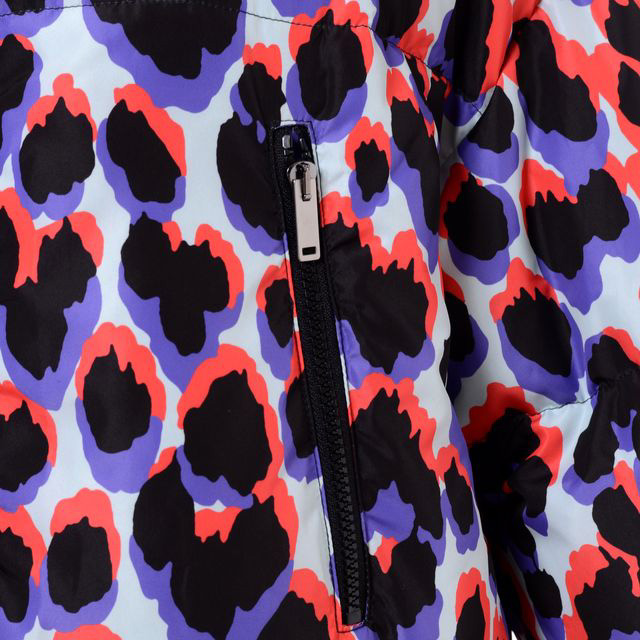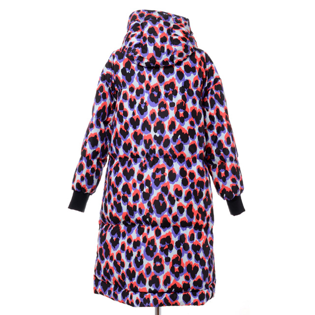 DOWNJACKET AZZURRA/Col.LEOPARD AQUA。キュートなカラーリングの中綿入りプリントコート 。パープル・コーラル・アクア・ブラックカラーを使ったレオパード柄。襟高。フード付。フードはスナップボタンで取り外し可能です。グースフェザーの中綿入り。ふかふかでとても軽い着心地。ダブルジップで開閉。ジッパー胸ポケット付。フラップポケット。袖リブ。程よくスポーティでフェミニンさもカジュアルさもミックスされた絶妙な一枚。寒い季節に映える、防寒にも最適なアイテムです。