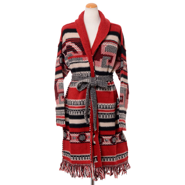 CARDIGAN JACQUARD AZUL/Col.OFF WHITE/TANGO RED/BLACK。アルゼンチンを巡る旅からインスパイアされたコレクション。ジャカード柄とウエストベルトが特徴的なローブロングカーディガン”AZUL”。ジャカード柄。コレクションテーマであるエッセンスが全面に表れた逸品。ふかっとした肌触りのアクリルウール混合ニット素材。裾はフリンジ。裏面の模様も可愛いので、タグを外せばリバーシブルとしてもお楽しみ頂けます。ウエストベルト付き。エスニックな雰囲気がたまらないキュートなカーディガン。ジーンズやスカート、ワイドパンツやワンピースなど、幅広いアイテムとお楽しみください。