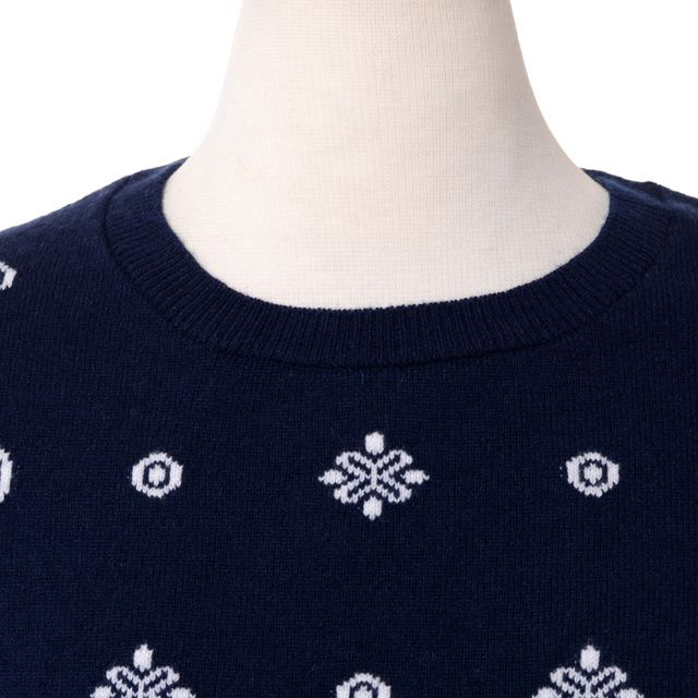Bandana T-shirts QB1807 NAVY/Luna White。ハンカチのバンダナモチーフをイメージしたインターシャ編み。丸襟でフィッティングはすっきりめ。ネイビーに白が映える合わせやすいセーターです。背中に、白で王冠の刺繍入り。今までにない細かなモチーフ使いの合わせやすいセーターです。