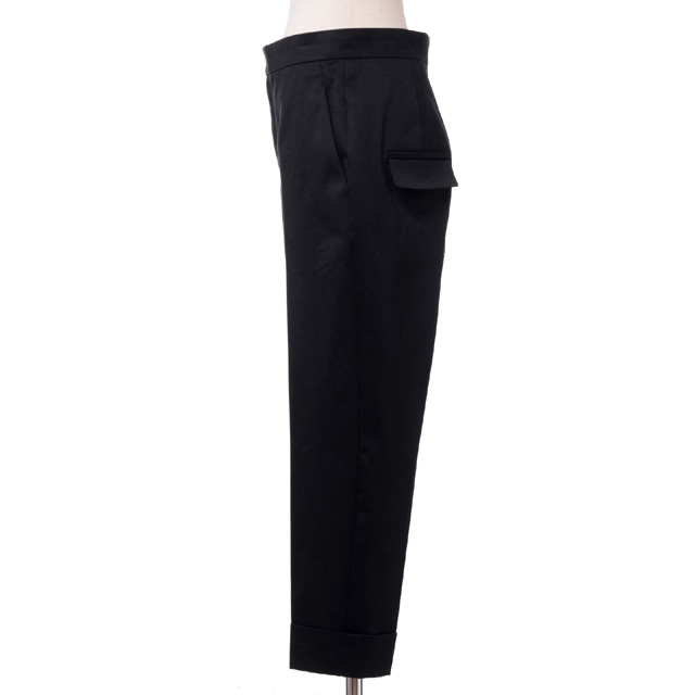 着やせして見える美脚パンツ。ポイントは下の方につけられたポケット使い。ハリ感のあるコットン生地で、両サイドにポケット、ヒップにもポケット付き。センターライン入りで、裾はロールアップ。前ファスナーでとても履きやすい、毎日履きたい着たいボトムスです。パタンナーのこだわりは、紳士服の仕立てです。見えない部分、ウエスト裏には異なる生地をあしらいオーダーメードの雰囲気です。特に、ヒップのポケットがポイントで、すっきりとしたシルエットです。