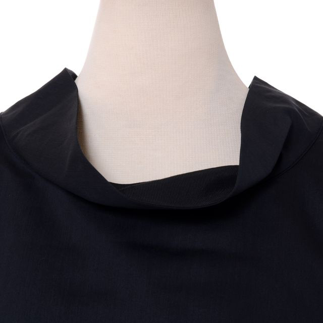 T-SHRTS DRESS。ロール襟や袖が特徴的な被りタイプのワンピース。さらりとした涼し気なコットンシルクの光沢のある生地。両サイドスリット入りで、紐でウエストを強調できるデザインです。シルエットはIラインで、ストンとお召いただける涼しいワンピースです。