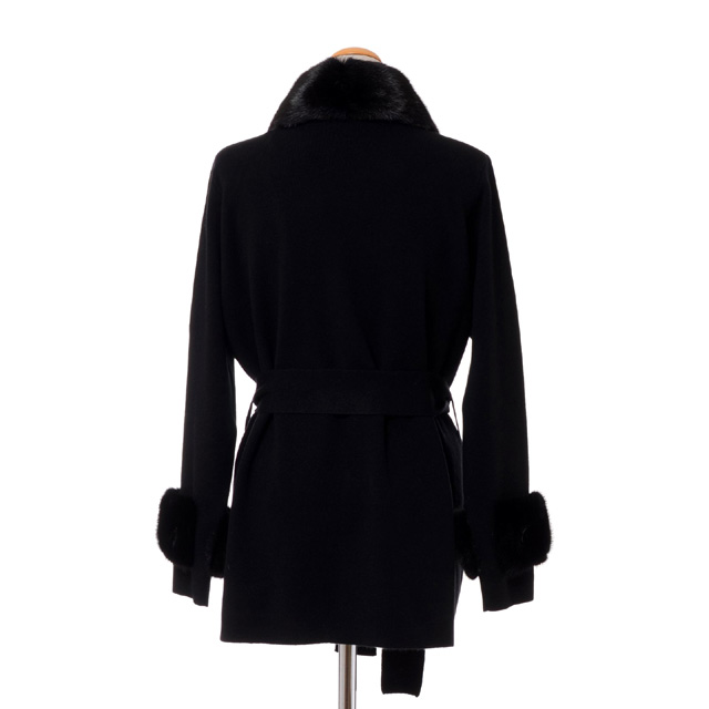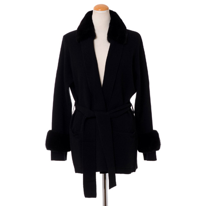 ミンクファー付きニットコート。厚手のカシミアハイゲージ編みのニットのヒップ丈。艶感のあるファーが特徴、ベルト付き。エレガントで上質な逸品です。