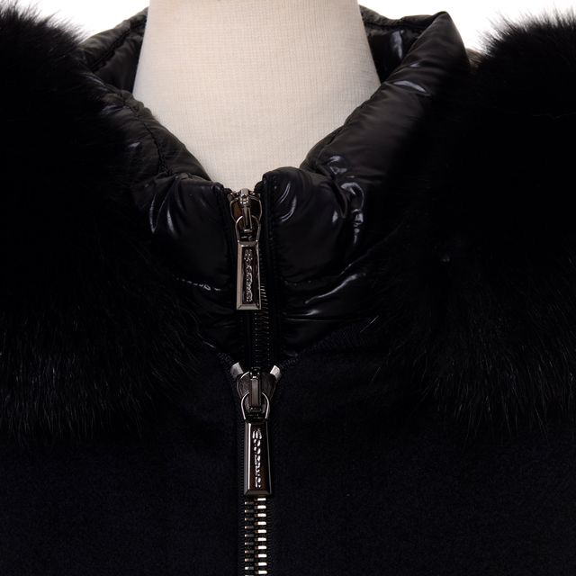 ケープジャケットとファーがついたフードダウンジャケットが組み合わされたエレガントなジャケット。ブラックカラー。ネックがニットで暖かいカシミヤ混合のダブルウールのショート丈のケープ付き。ダウンジャケットは内側の袖口がチューブニットで、中わたが最上級のグースダウン。ケープとダウンは取り外し可能。ダウンフードのファーも取り外し可能。上品なフードはリアルフォックスのトリミング仕上げ。カンジャンテの微かなニュアンスを持つ高級20デニールのナイロンの生地で製作。ケープジャケットはカシミヤ混のダブルウール素材。起毛仕上げ。ダウンジャケットは光沢のある最高級20 デニールのナイロン素材。中わたはピュアなグースダウン。