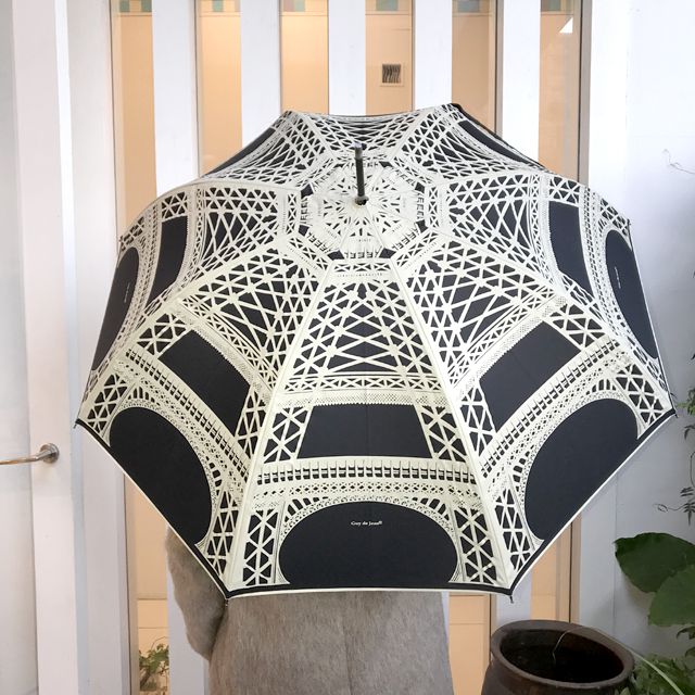 ギドゥジャン「EIFFEL」。全体にエッフェル塔をプリントした長傘。ブラックカラー。撥水加工ポリエステル素材。柄が内側からも透けて見え、どこから見ても可愛いアイテム。大きめの身体をすっぽりと覆うフォルムで、豪雨の時にもオススメできるフランス製の傘です。中の筒は、木で作られており壊れにくいフォルム。梅雨の時期も気分明るくお出かけが楽しくなる傘です。フランスの歴史を感じさせる、雰囲気のあるアイテムは他にはなく、愛用者が多いアイテムです。カラー展開、アイボリー・ブラック。