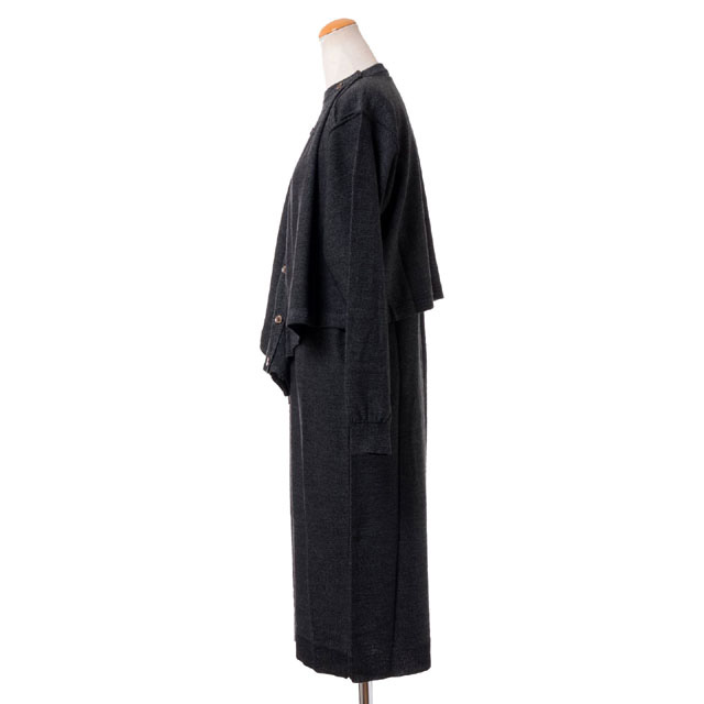 DOUBLE LAYER CARDIGAN DRESS ボレロカーディガンを羽織っているようなデザインのニットワンピース。一枚で完成されたシルエット。レイヤードスタイルが苦手な方にぜひ挑戦して欲しいアイテムです。さらりとしたメリノウールとアクリルミックス素材。上にコートをプラスしてブーツと合わせて着こなしたい膝下丈のアイテムです。カラーバリエーションも豊富で一枚あるとご旅行にもぴったりなアイテムです。カラー展開、サブマリン・マスタード・ブラック。