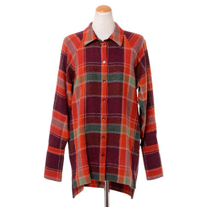 COCOON SHIRT WOOL PLAID オレンジベースの暖かみのあるチェックシャツ。素材はやわらかなウールフラノ。ラグランスリーブで、リラックスしたフォルム。お揃いのウエストゴムパンツも入荷しております。