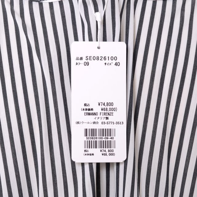 Ermanno Firenze。襟元の刺繍とタッセル使いが美しいVネック変形ブラウスです。さわやかなストライプ柄。表部分は丈短めで後ろ側は長めですっきりと見えるフォルム。袖はロールアップ仕上げ。薄手で涼しい素材の印象的なブラウスです。カラー展開、ブルー・レッド・ブラック。