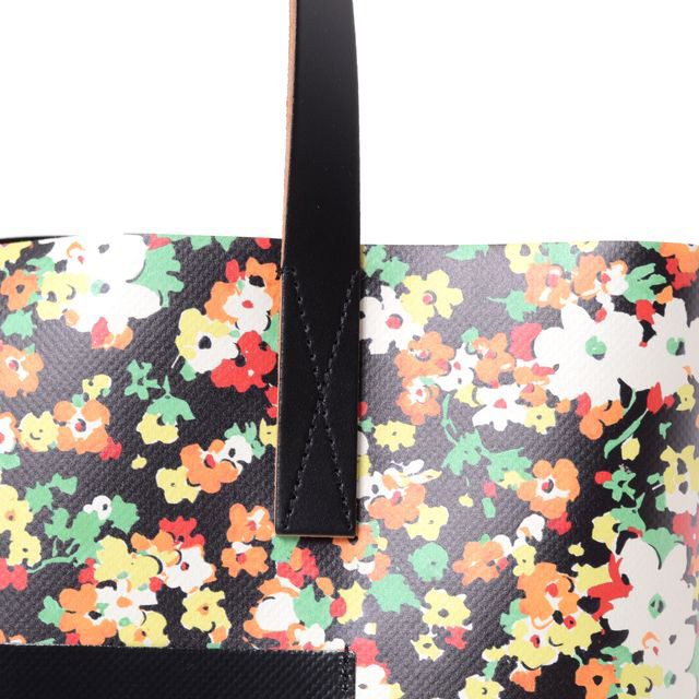 Lovers Prairieプリント入りのEast/Westショッピングバッグ。スモールサイズ。横長のフラワープリントがキュートなバッグ。レザーハンドル、エンボスロゴ入りタグ。フロントにマルニロゴ入りフラットポケット。超軽量。ダブルハンドル。肩掛け可能。デイリー使いにぴったりなサイズ感です。付属:ロゴ入り布製収納袋。