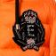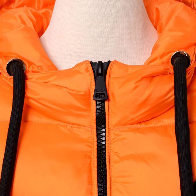 Ermanno Firenze。着丈短めのショート丈コート。胸元に豪華なロゴ入り刺繍をあしらったダブルジッパーコート。発色の美しいオレンジカラー。フード付きのさらりとお召いただける中綿コートです。