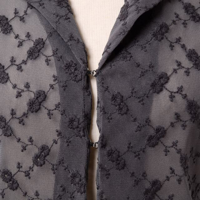 CHIKAKISADA 襟付きのブラウス。グレーカラーのパワーネットに刺繍をあしらったアイテム。鍵ホック。ジャケットのように羽織ものとして、重宝される生地感です。