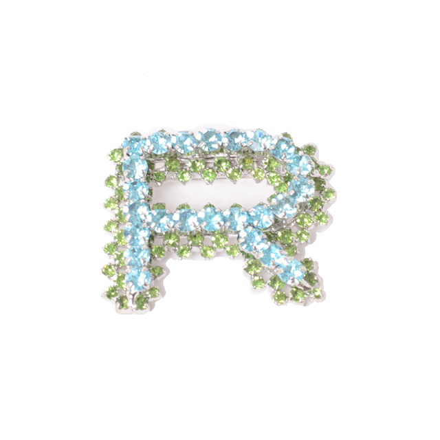 Rモチーフのクリスタルブローチ。台座は細かなクリスタルと上の台座はやや大き目のクリスタル、色も素敵なブローチです。カラー展開、ブライトグリーン・ライトパステルブルー。