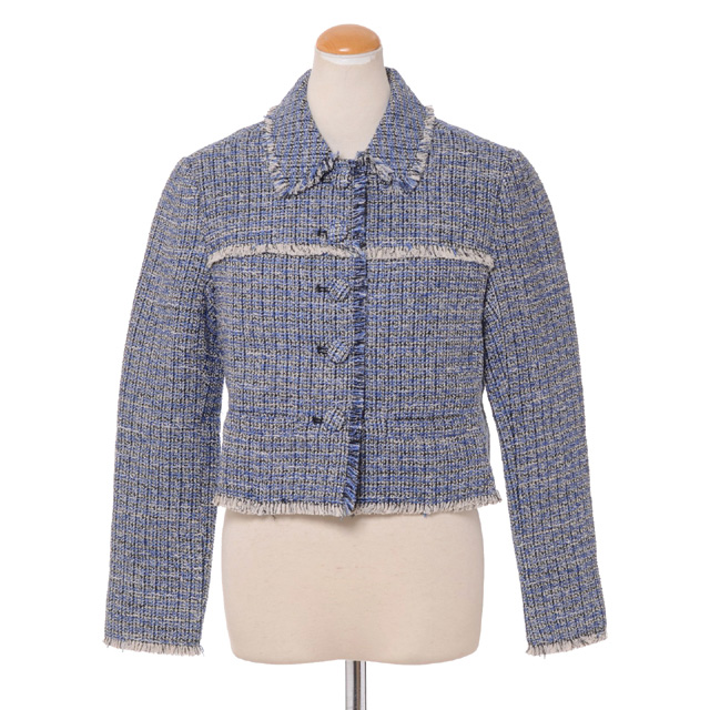 White Label Cropped Tweed Jacket 襟付きのツィードジャケット。ブルー×ホワイト×ブラックのさわやかな色合いのショート丈のジャケットです。裾にフリンジ付き。