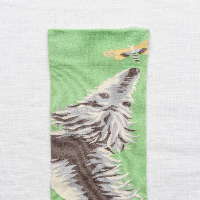 テーマは「Pique-Nique」「Dog」くすんだブルーのつま先、躍動感のあるワンコと庭をモチーフにした、ミントグリーンのソックスです。肌触りの良いコットン混合で、クルーソックス。ロゴ入り紙パッケージ入り。