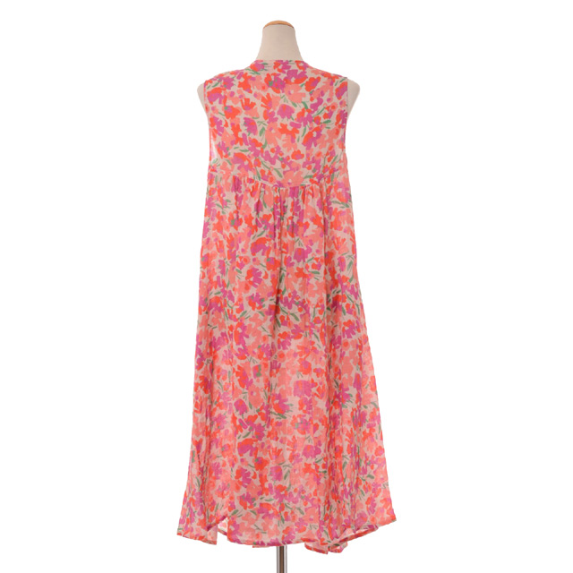 カラフルなピンクやパープルの花をプリントしたノースリーブワンピース。胸元にタック使い、両サイドにポケット付き。肌触りの良いリネン生地で真夏にぴったりなアイテムです。