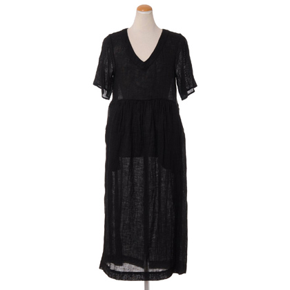 Vネックの半袖ワンピース。ウエスト切り替えでドレープ使いになったフェミニンな一枚です。肌触りの良いリネンガーゼ。着丈も長め、両サイドにポケット付き。カラー展開、オリーブ・ブラック。