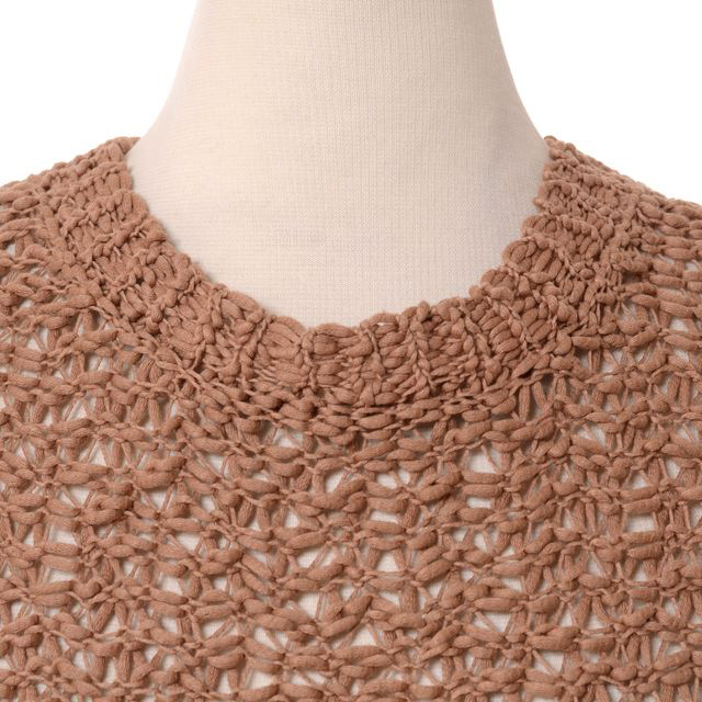 フレンチスリーブの透かし編みコットンセーター。重ね着にぴったりなニット。色が素敵なキャメルカラーでワイドパンツと合わせて着こなしたいセーターです。