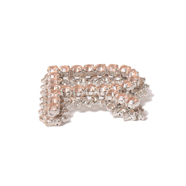 BROOCH IN CRYSTALS AND METAL Rモチーフのクリスタルブローチ。台座は細かなクリスタルと上の台座はやや大き目のクリスタル、色も素敵なブローチです。カラー展開、シルバーブラック・シルバーイエロー。