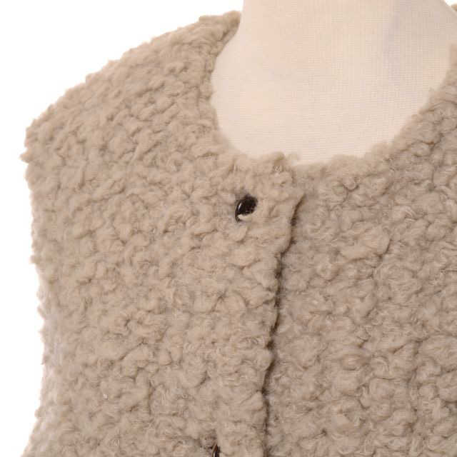 ふっくらとしたリアルファーのベスト。とても軽くコーディネイトが楽しくなりそうな羽織物です。ボタン、両サイドポケット付き。同系色のコーディネイトで着こなしたいアイテムです。インポートの生地を使用した、ファッションエディター萩原輝美さんによるクチュール技が光るアイテムです。