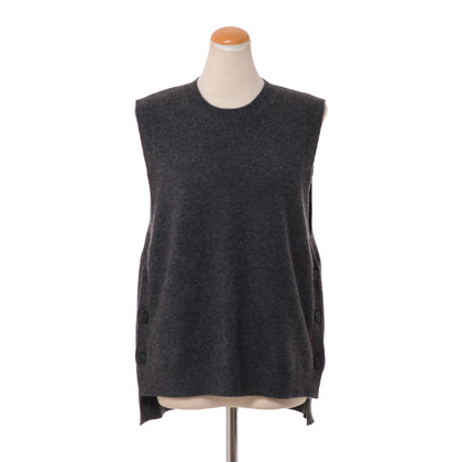 脇ボタンのノースリーブニットベスト。ふんわりとした上質なカシミアハイゲージ編み、後ろ側が若干長くなっているデザインです。ニットやシャツに重ね着をしたり、ワンピースの上にプラスしても素敵なアイテムです。カラー展開、チャコール・グレージュ。
