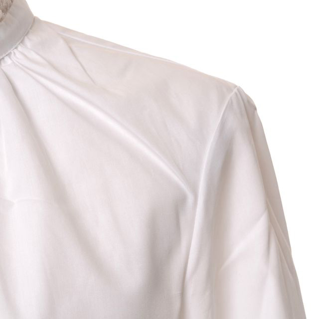 SHIRT WITH SMALL LACE RUFFLED COLLAR ガーリーなレース襟のホワイトブラウス。隠しボタンのシンプルかつ美しいコットン生地。デザイナー自身が2022年ノルウェーに旅をし、そのときに出会ったオーロラ、トロールが住む雄大なフィヨルド、ラグーン・・素晴らしい自然を体感。そのインスピレーションよりつくられたコレクション。