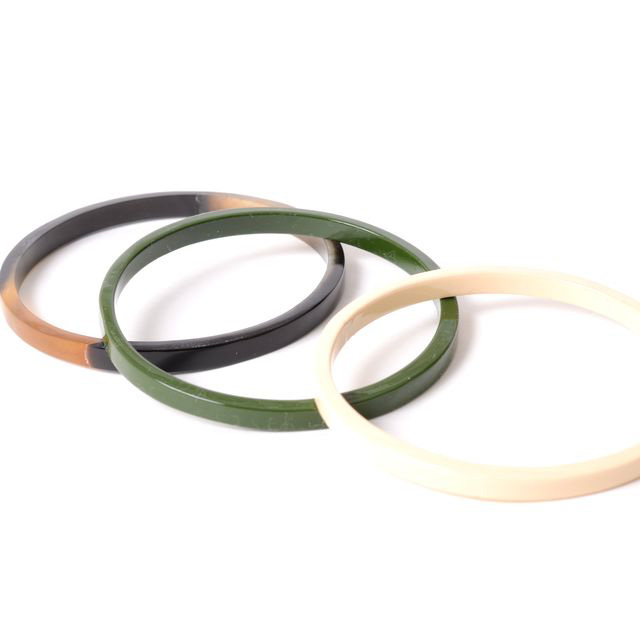 3連バングル。シックなカラーリングのバングル。軽い水牛の角でつくられたバングルです。シーズンレスでお使いいただけます。プレゼントにもオススメ。時計と重ねてつけても素敵。バングル同士重なると音が鳴り、癒される効果があります。収納袋付。※全て天然物による水牛の角のためお色味の風合いなど1点1点異なります。また、着装画も全てイメージとなり実際のアイテムとお色味風合いが異なりますことご了承くださいませ。