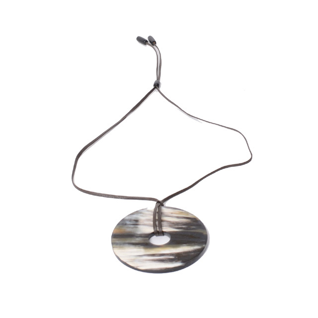 大ぶりなディスク型ネックレス。両面お使いいただける暖かみのあるネックレスです。軽い水牛の角で作られており、温かみのある素材感です。プレゼントにもおすすめです。収納袋付き。※全て天然物による水牛の角のためお色味の風合いなど1点1点異なります。また、着装画も全てイメージとなり実際のアイテムとお色味風合いが異なりますことご了承くださいませ。