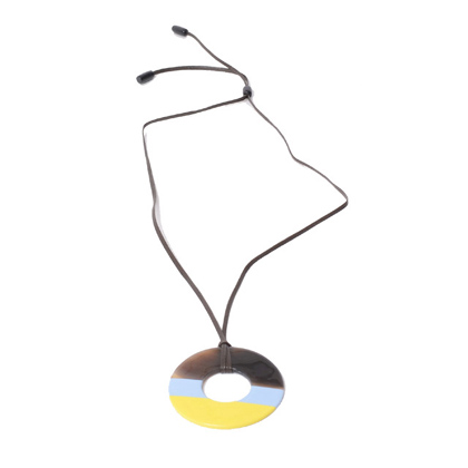 ドーナツ型ディスクペンダント。カラーバリエーションがが際立つアイテムです。軽い水牛の角でつくらえたネックレスです。両面お使いいただけます。軽い水牛の角で作られており、温かみのある素材感です。プレゼントにもおすすめです。収納袋付き。※全て天然物による水牛の角のためお色味の風合いなど1点1点異なります。また、着装画も全てイメージとなり実際のアイテムとお色味風合いが異なりますことご了承くださいませ。