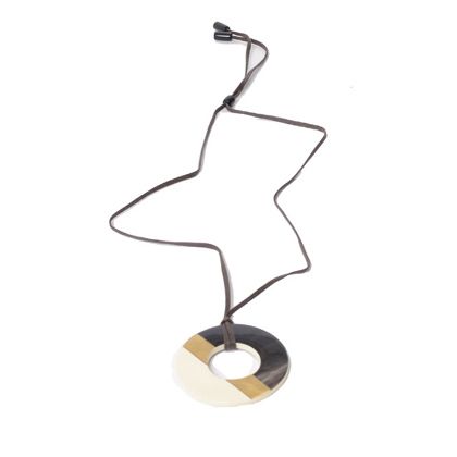 ドーナツ型ペンダント。ゴールドカラーが際立つアイテムです。軽い水牛の角でつくらえたネックレスです。両面お使いいただけます。軽い水牛の角で作られており、温かみのある素材感です。プレゼントにもおすすめです。収納袋付き。※全て天然物による水牛の角のためお色味の風合いなど1点1点異なります。また、着装画も全てイメージとなり実際のアイテムとお色味風合いが異なりますことご了承くださいませ。