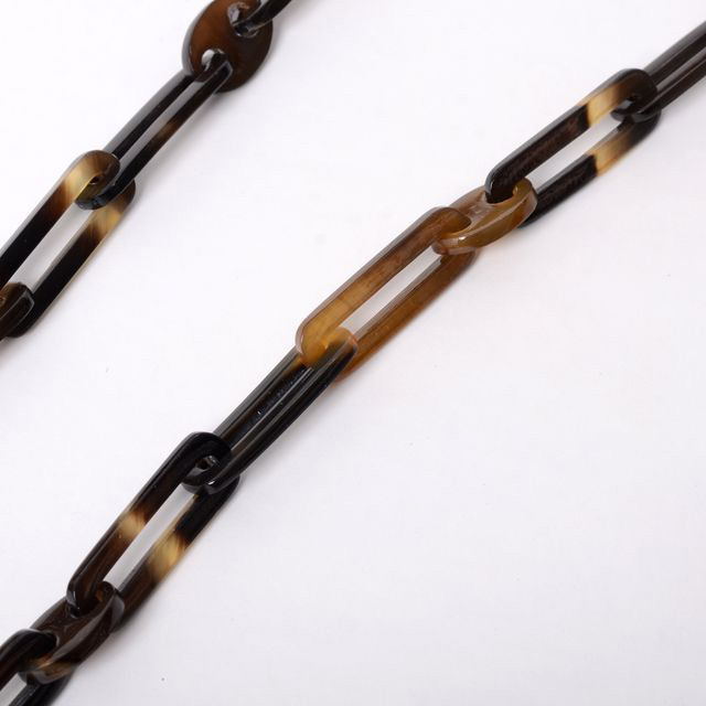 3種類のチェーンを重ねたグラスチェーン。眼鏡チェーンとして、ネックレスとしてもお使い抱けるアイテムです。異なる色合いの水牛の角をリング状に重ね合わせたアイテムです。軽い水牛の角で作られており、温かみのある素材感です。プレゼントにもおすすめです。収納袋付き。※全て天然物による水牛の角のためお色味の風合いなど1点1点異なります。また、着装画も全てイメージとなり実際のアイテムとお色味風合いが異なりますことご了承くださいませ。