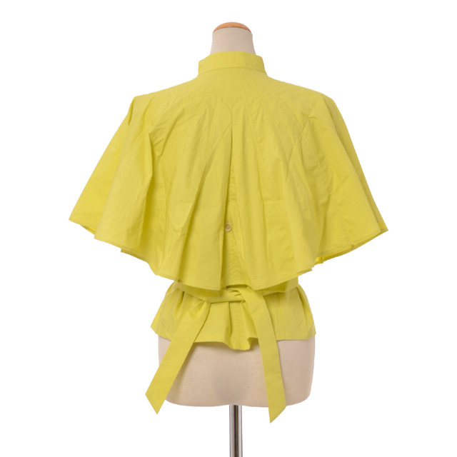 ショート丈ブラウス。裾はタイトで、リボン付き。ジャケット風にもお召いただけるブラウスです。立ち襟で、エレガントカジュアルなフォルム。カラー展開、レモン・ホワイト。