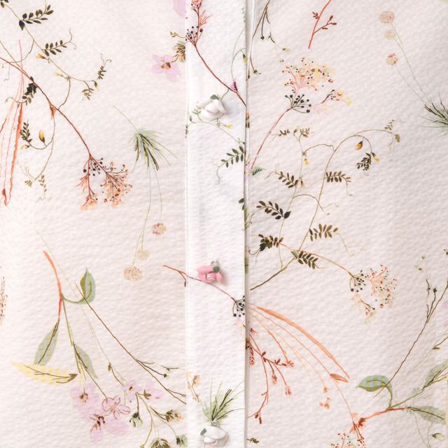 ロマンティックで素敵、きれいなカラーや着心地の良い素材を選びぬいたクリスティーナティが再登場しました。だれかと同じ服ではなく、全くのオリジナリティあふれる私らしい装いを体現できるアイテムたち。パステルカラーやオリジナルプリントたちに囲まれて、上質な暮らしをしてみませんか。女性らしいフラワープリントのブラウス。薔薇モチーフのボタン。袖口はゴムで被りタイプです。ハリ感のあるワッフルコットン生地で着心地がよく、涼しくストレスなくお過ごしいただけます。