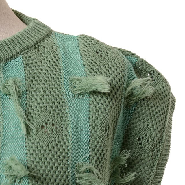 ロマンティックで素敵、きれいなカラーや着心地の良い素材を選びぬいたクリスティーナティが再登場しました。だれかと同じ服ではなく、全くのオリジナリティあふれる私らしい装いを体現できるアイテムたち。パステルカラーやオリジナルプリントたちに囲まれて、上質な暮らしをしてみませんか。ショート丈のフリンジ使いセーター。キュートなフォルムのセーター。編地も何種類も使い、凝った仕上がりになっています。フリンジ使いのおしゃれなセーターです。カラー展開、アイボリー・グリーン。
