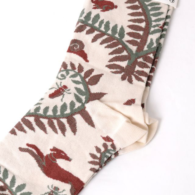 舞台、春の蔦の様子をイメージしたソックス。白地にバーガンディ、シダー グリーンカラー。幸運の象徴のてんとう虫やミツバチ、うさぎ、犬。つま先はピーチピンク。春らしいソックスです。